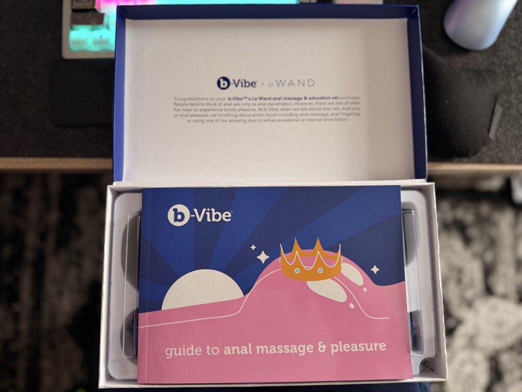 The guide that comes with this kit is not a flimsy pamphlet. It is a real guide to anal massage and pleasure. I absolutely love that B-Vibe included a physical book. In an age where we often have to search the internet for reliable sex info, and sift through a lot of sketchy advice, here you get a curated, expert approved guide right in the box. It is like having a friendly coach on your nightstand.