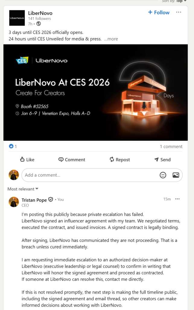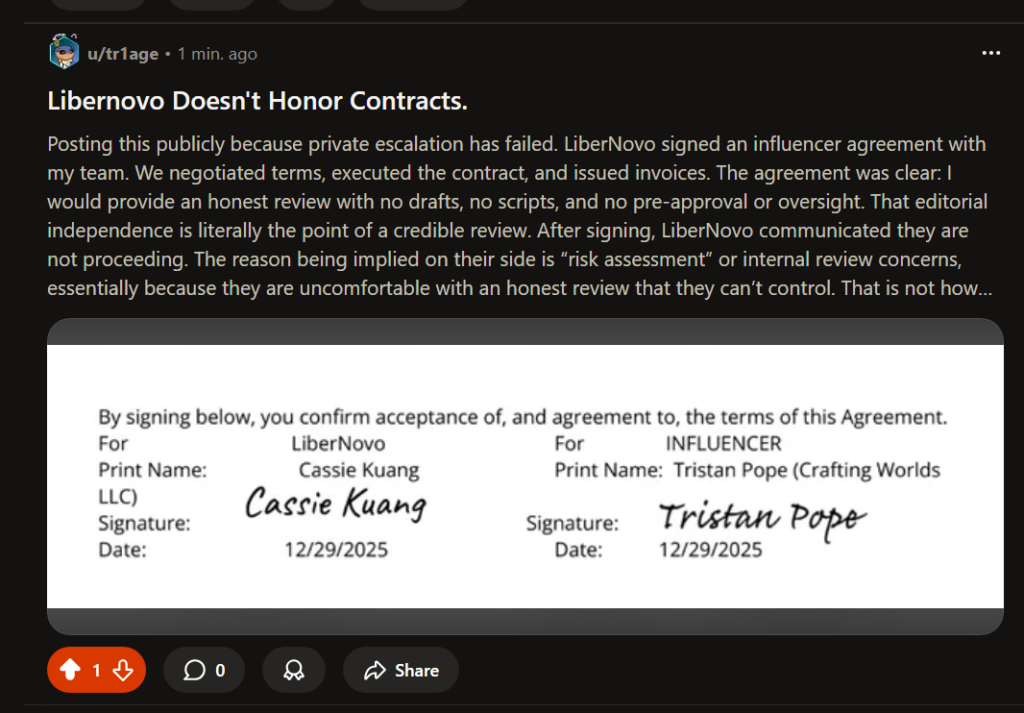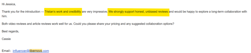 In late 2025, Cassie from LiberNovo’s “media team” reached out to my business email.