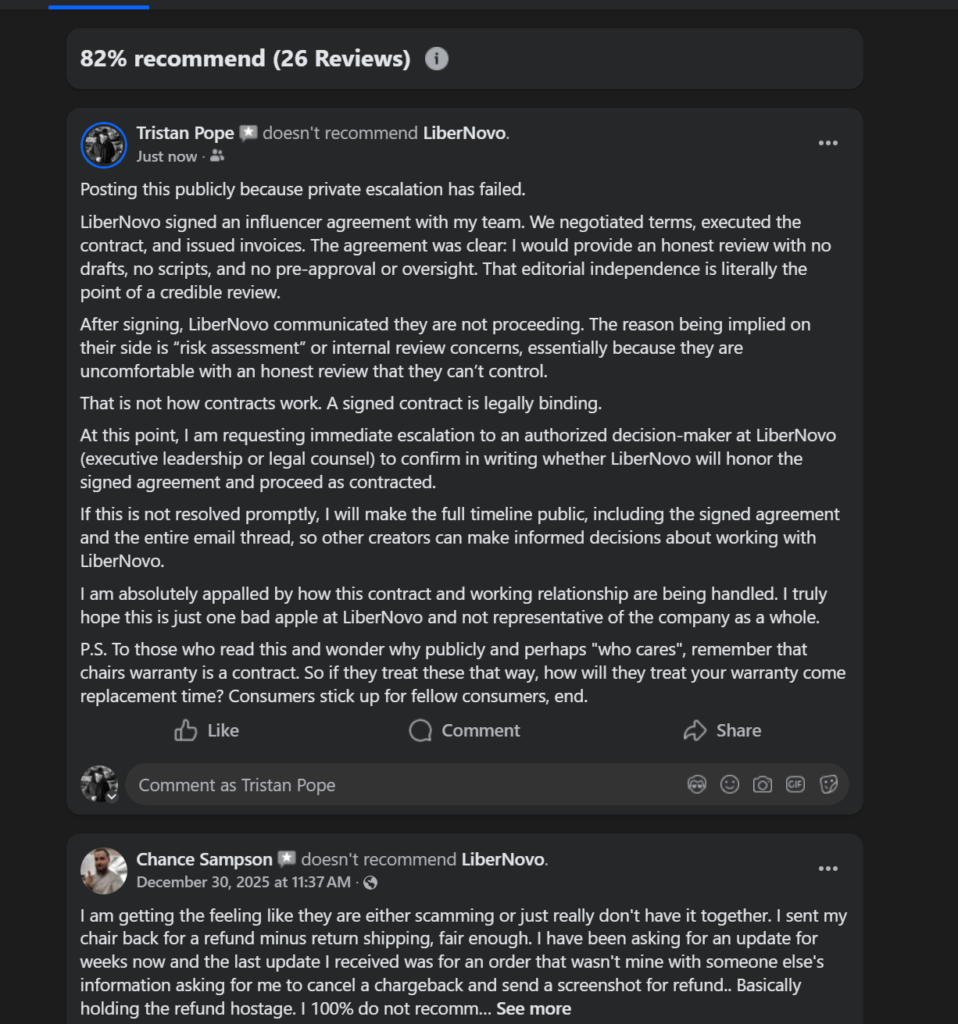 “It seems like LiberNovo has no problem shipping chairs (for free) to the YouTubers to get reviewed; but when a paying customer wants one there is no one to be found.”