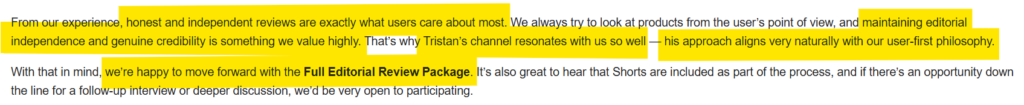 “We appreciate the in depth, honest nature of your reviews and believe your expertise and unique style of content creation would be a great fit for our brand.”