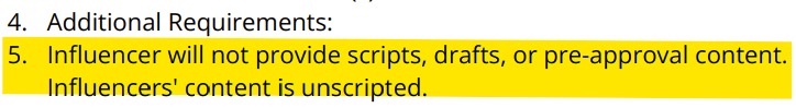 “Influencer will have to obtain the final approval of the Brand before officially publishing the video(s).”