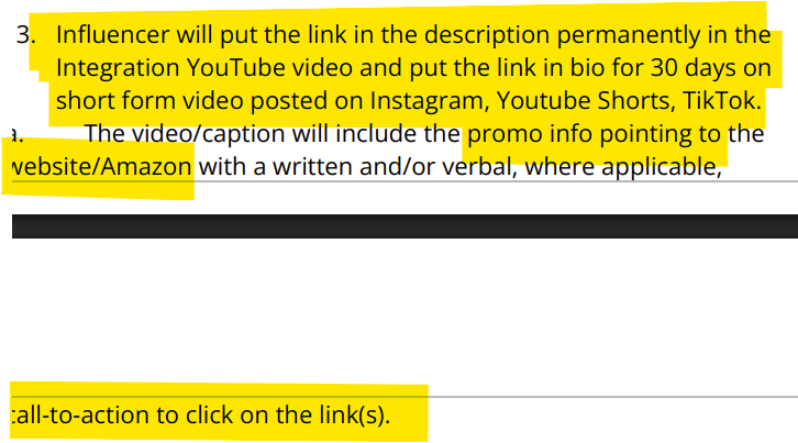 “The remaining fifty percent (50 percent) shall be paid within 5 business days of publication of video and may not be withheld due to disagreement with the Influencer’s opinions, conclusions, or subjective evaluation.”