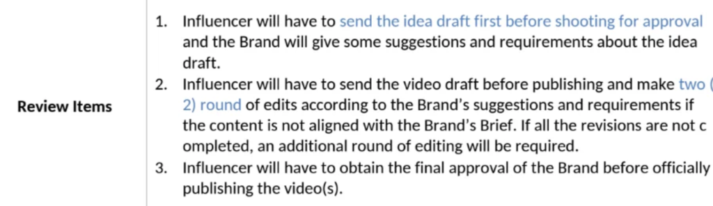 “Influencer will have to send the video draft before publishing and make two (2) round of edits according to the Brand’s suggestions and requirements if the content is not aligned with the Brand’s Brief. If all the revisions are not completed, an additional round of editing will be required.”