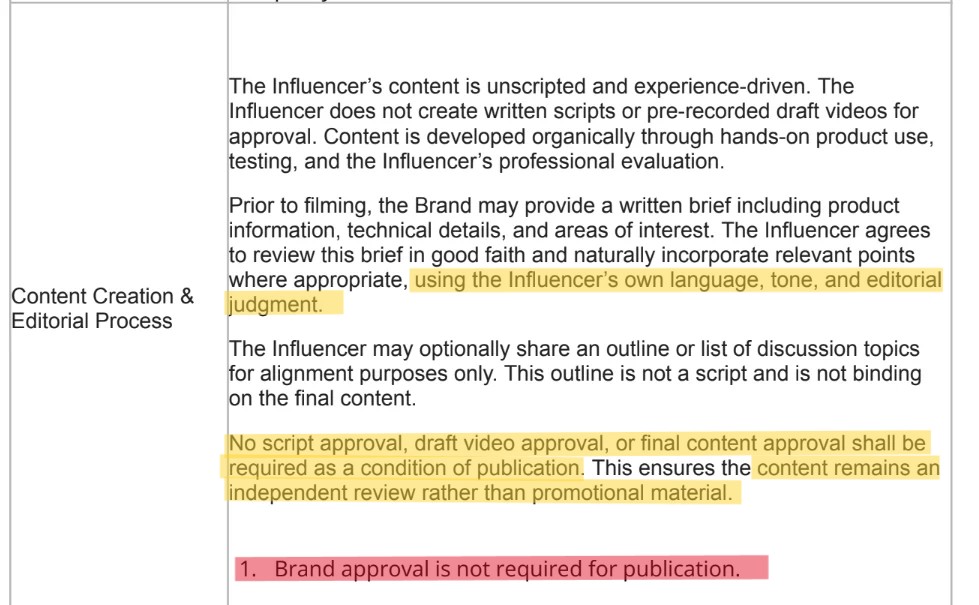 - The Brand cannot force script changes, cannot demand cuts to my opinions, and cannot block publication because they dislike my conclusions.