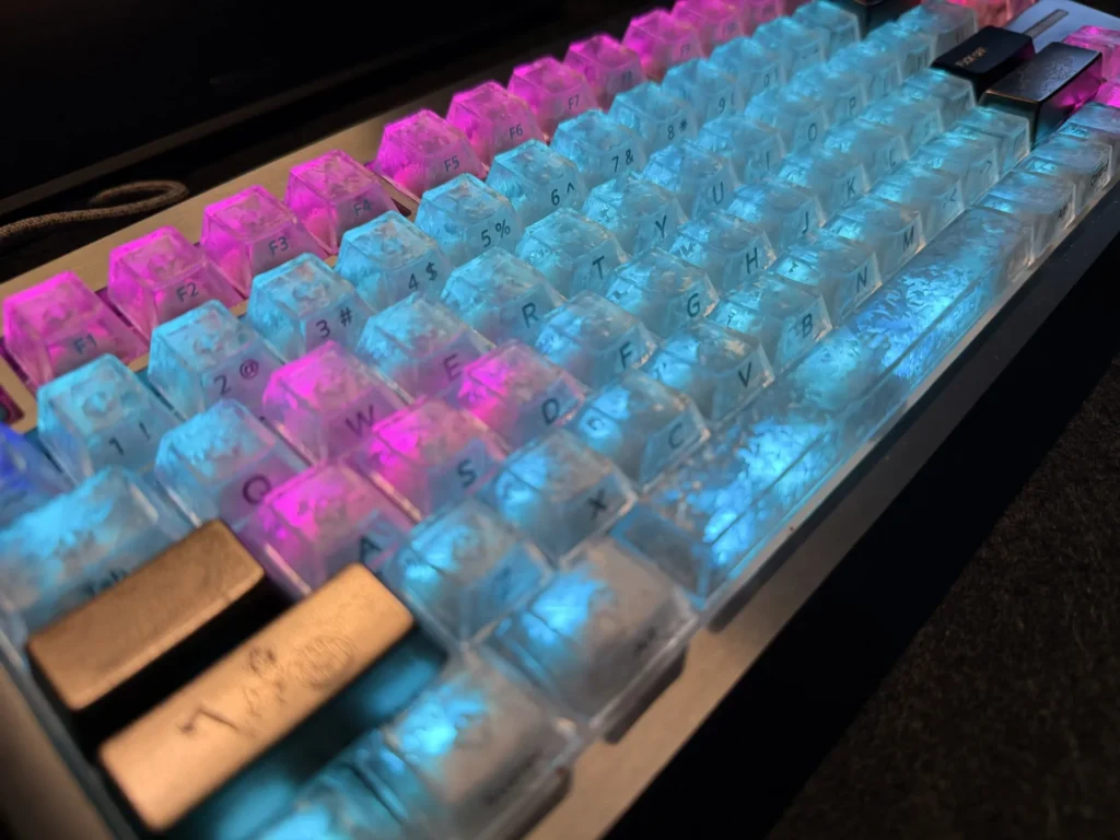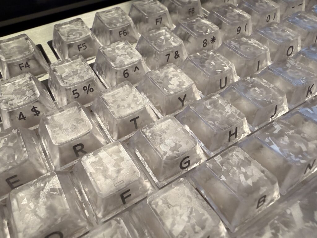The Clear Ice version has a look that immediately stands out in person. They are transparent, obviously, but they are not plain or flat. There is texture and depth inside them that gives the whole set this frozen, almost crystalline look. In regular daylight they already look clean and premium, but once lighting hits them, they start doing exactly what you want a clear keycap set to do.