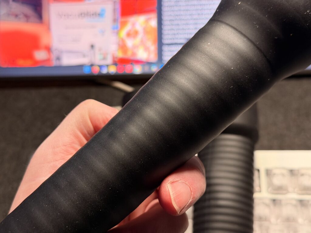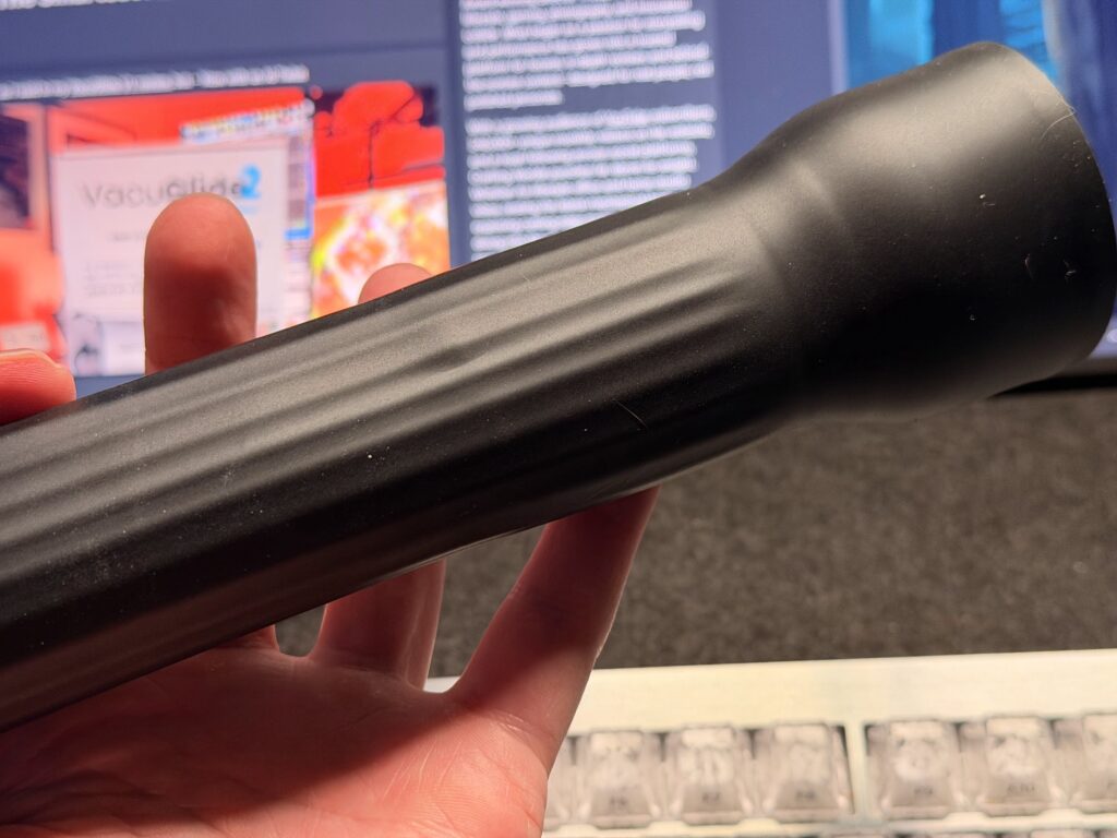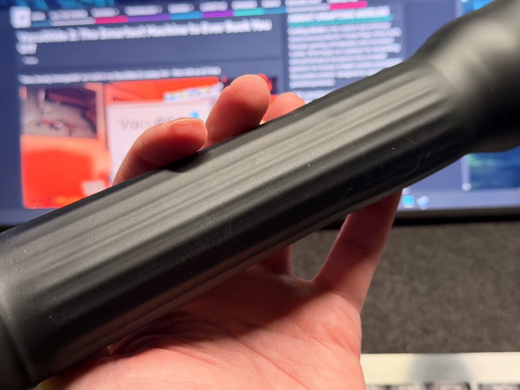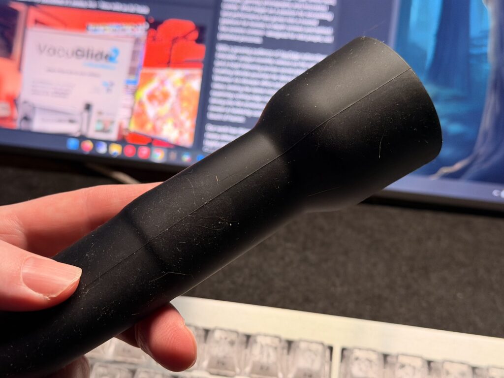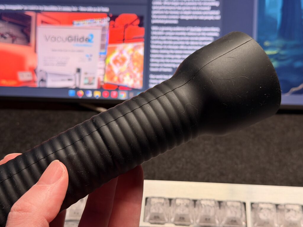 But calmer doesn’t mean boring. In fact, the Glide Rail has a trick up its… well, sleeve. Because the ribs run top to bottom, a simple twist of the VacuGlide’s hose or a nudge to one side makes the sleeve move, and when that happens, those vertical ribs move around your shaft in an Oh… OH.. moment.