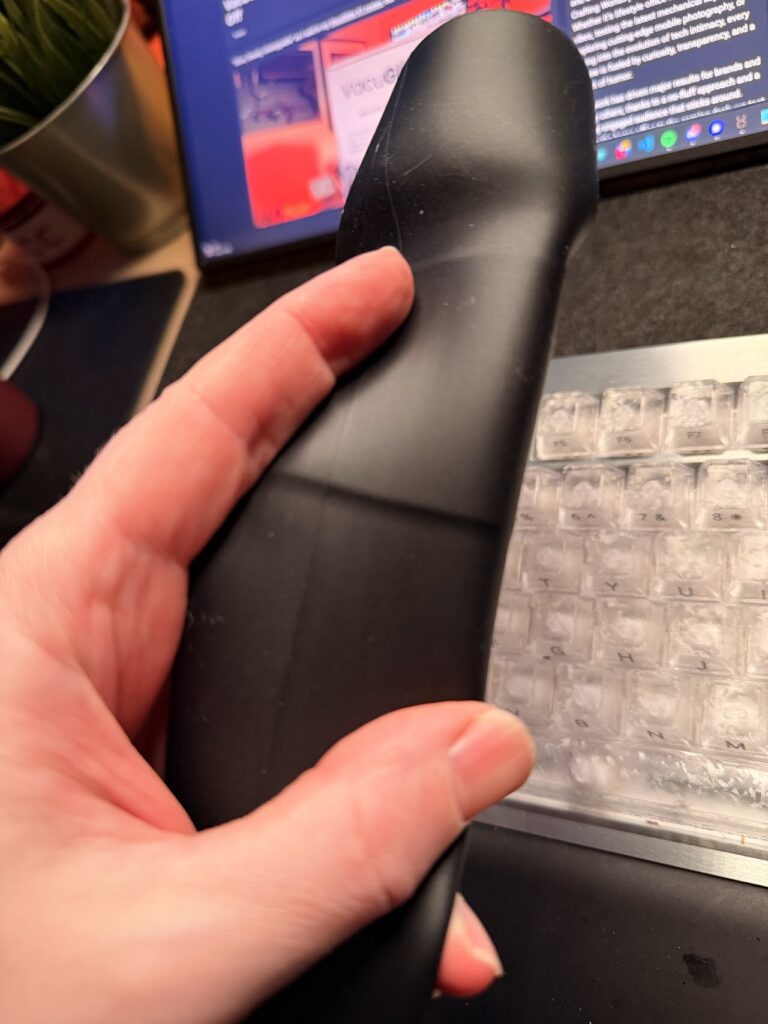 Intensity & orgasm control: The Power Pulse sleeve creates a noticeably more aggressive texture and suction feel. Those wider-spaced ribs give you distinct peaks of stimulation; you can actually count the ribs sliding over you one by one (not that you’ll be doing much math in that moment). This translates to a much harder tug on each stroke. Frankly, it feels just like a handjob, a forceful handjob. I found that even at lower speed settings, the Power Pulse made the VacuGlide feel like it was turned up to 11. It’s the sleeve for when you don’t want to slow-roll toward climax: you want to be dragged there, kicking and moaning. During my trials, it was near-impossible not to climax significantly faster than usual with the Power Pulse. It’s like the device is whispering Finish him! (in full Mortal Kombat announcer voice) every time those thick ribs surge by.